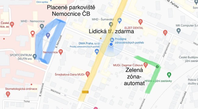 Na Lidické třídě zdarma (obtížné najít místo)Placené komfortně na parkovišti Nemocnice České Budějovice či v ulici v rámci zelené zóny (automat). V ostatních ulicích je modrá zóna (placení přes aplikaci). Za tratí směrem do Rožnova kdekoli (bez modrých zón, cca 5 min. dochozí vzdálenost).